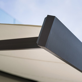 Il nome "Nodo" non è casuale: rappresenta l’elemento centrale della struttura, dove l’intersezione tra staffa a muro ed il cassonetto diventa motivo ispiratore e sintesi del disegno complessivo. Il frontale della tenda ha un duplice ruolo: completare e chiudere il cassonetto quando la tenda è raccolta e definisce la parte frontale della stessa quando totalmente aperta.